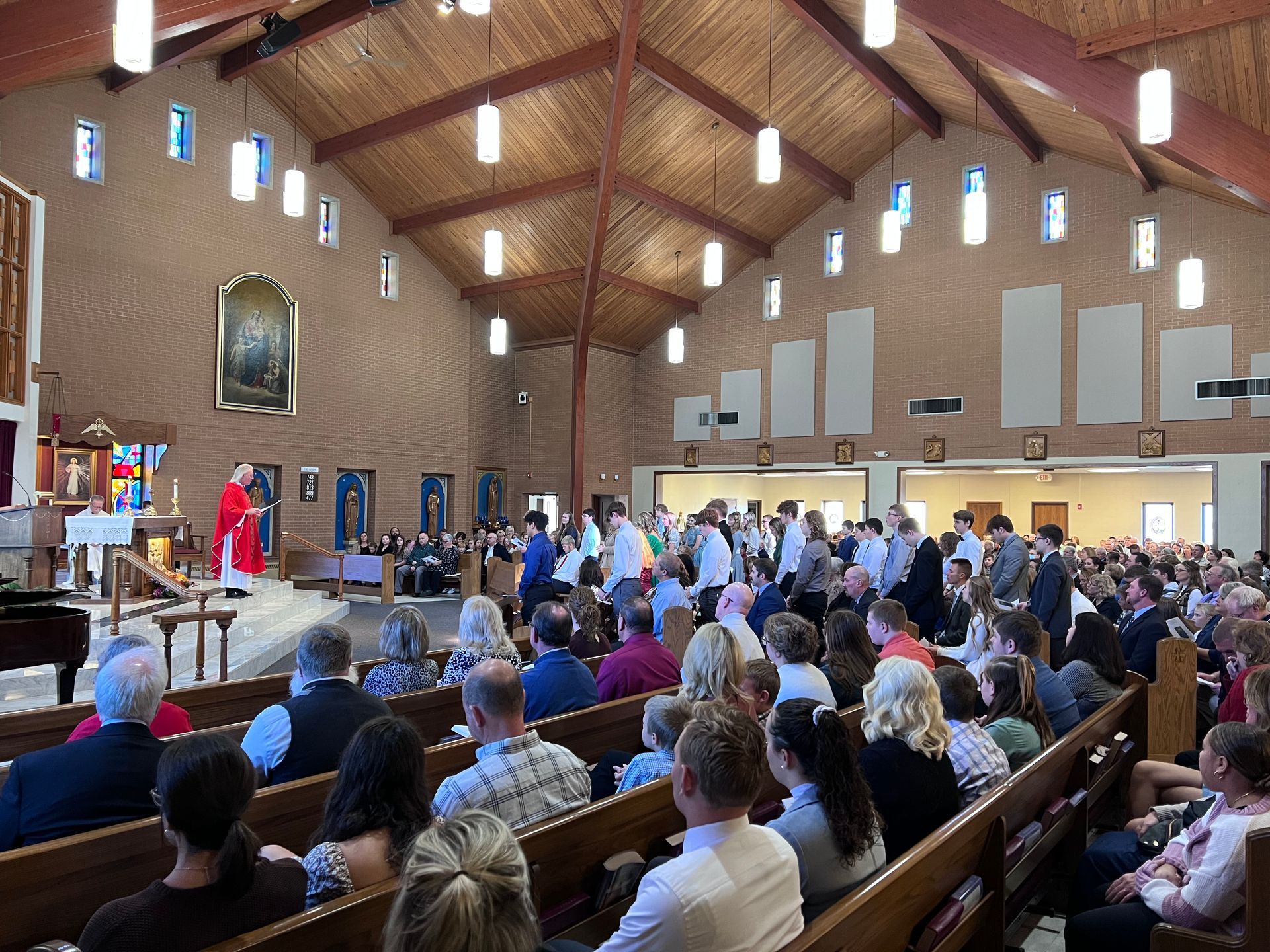 Holy Rosary Catholic Church is a Roman Catholic parish on the east side of St. Marys. Established in 1867, the church has been recognized for its historic 1860s church building, which was demolished amid a period of growth in the 1970s and replaced with a modernist structure. In 2015, renovations took place which included a new altar, ambo, baptismal font, addition of seating due to growth, an Adoration Chapel, and connecting the church to the school.