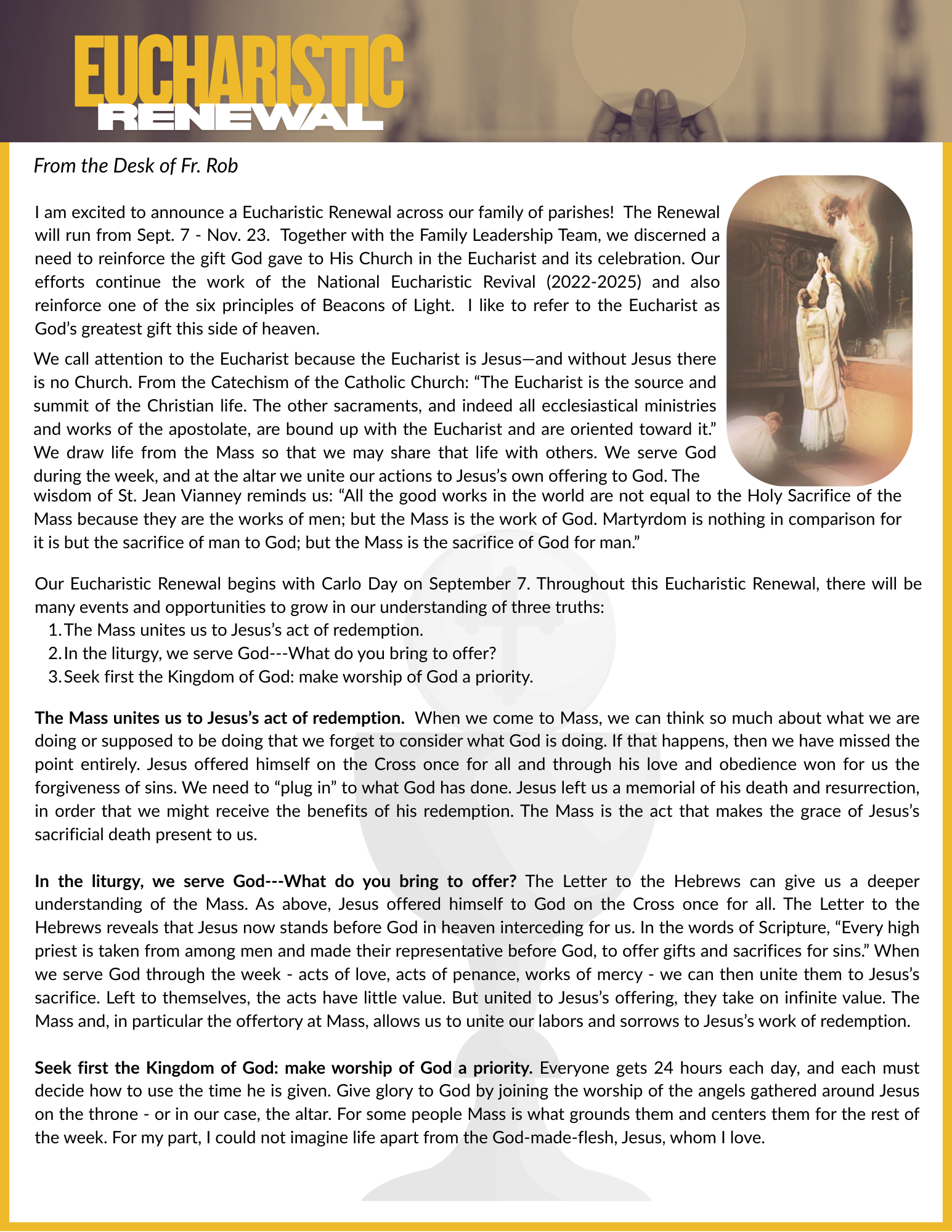 Eucharistic Renewal Mission began on September 7, Carlo Day. This Mission will continue through the next few months with closing ceremonies on Nov. 23, Christ the King.