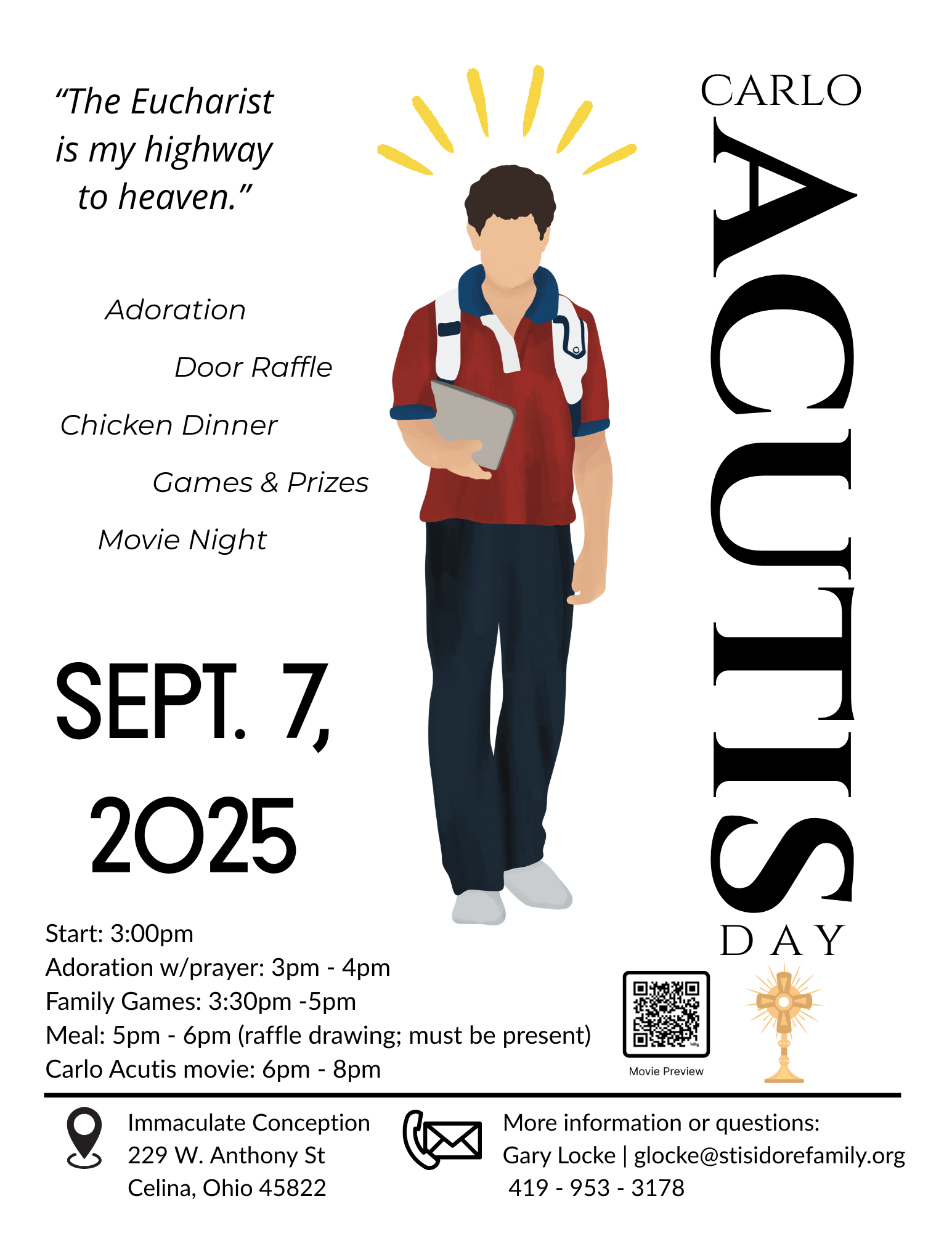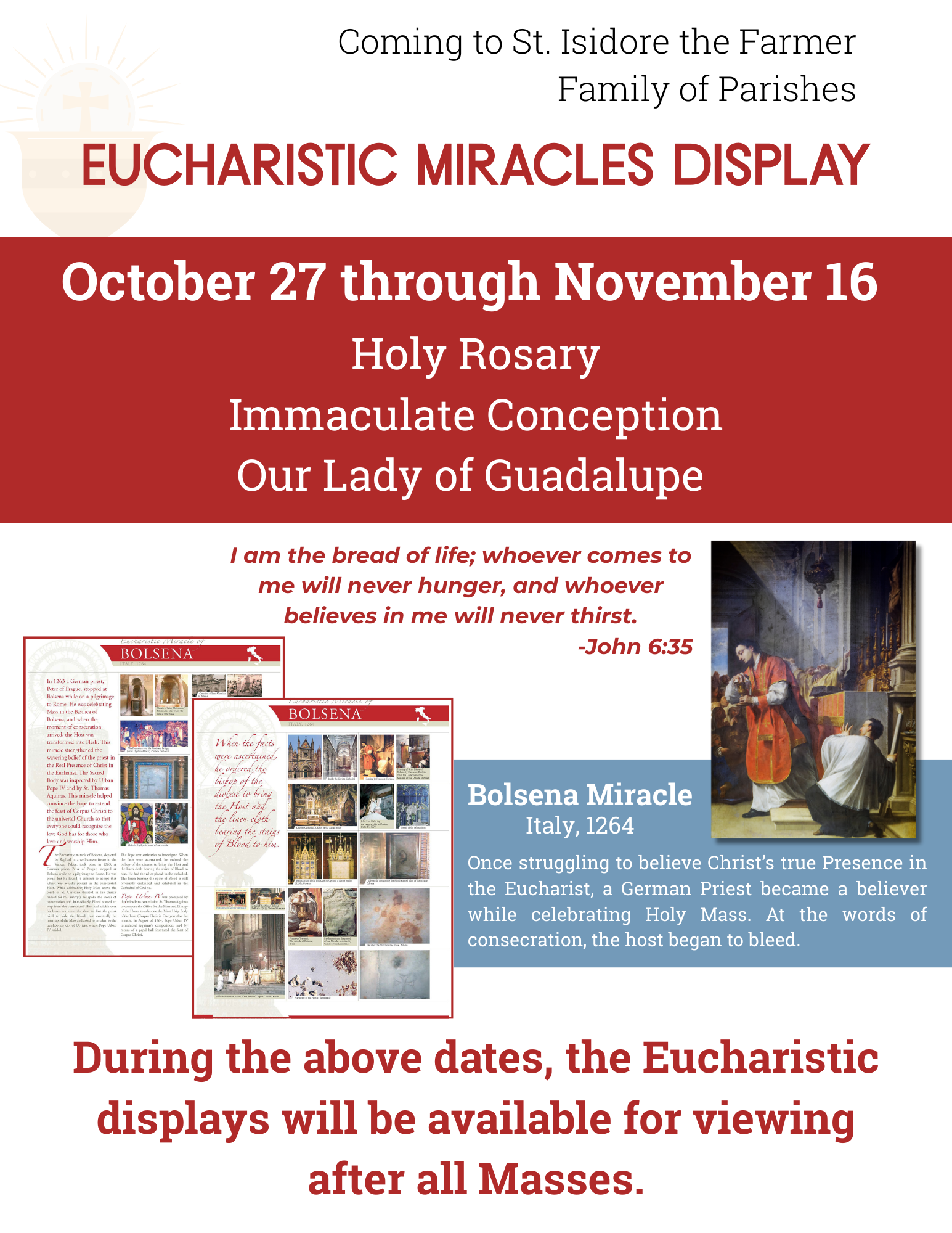 The Eucharistic Displays of St. Carlo Acutis will be on display during this time at Holy Rosary, Immaculate Conception, and Our Lady of Guadalupe. At this moment, viewing times will be after all Masses.