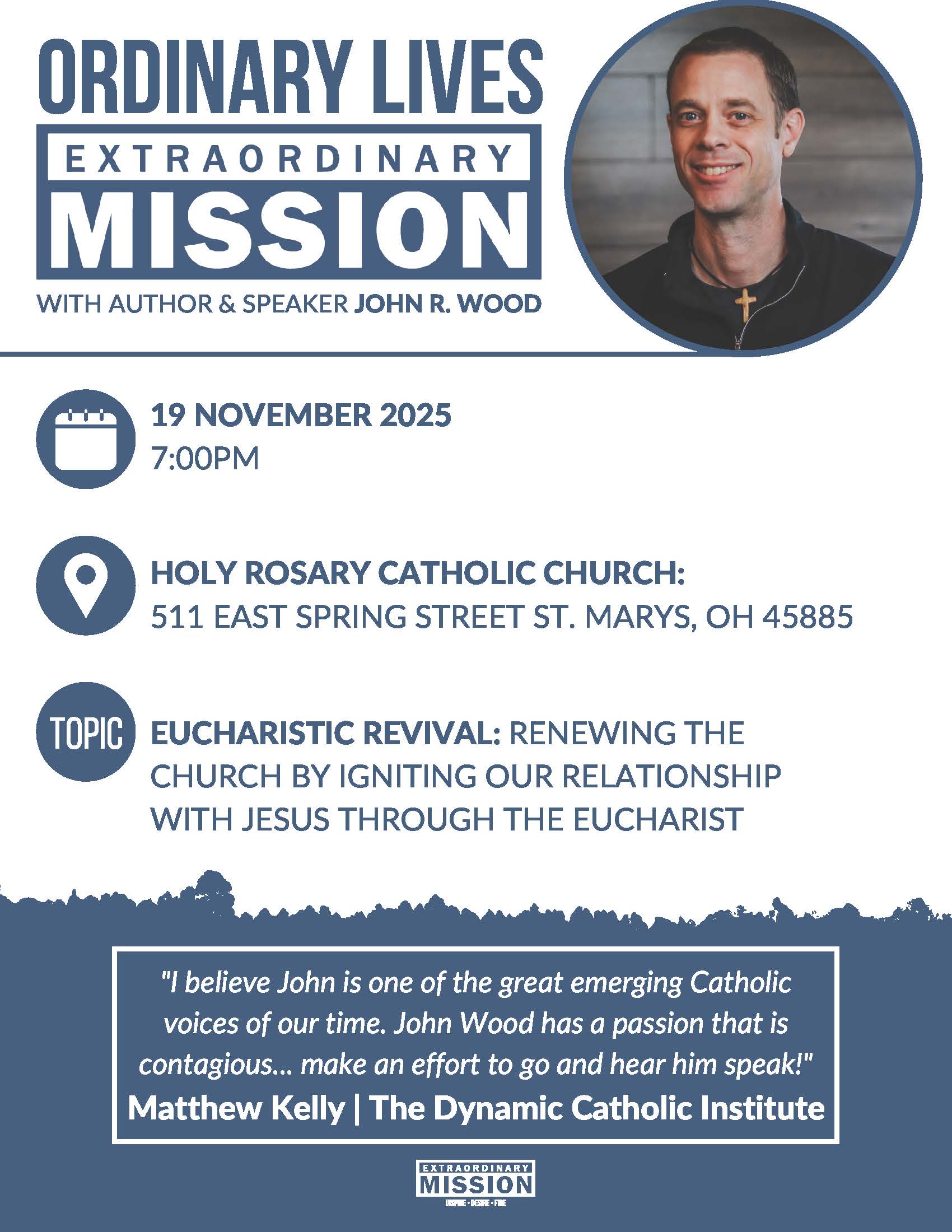 On Wednesday, Nov. 19, we welcome author and speaker John Wood to Our Family of Parishes. John will give a talk on Eucharistic Revival.