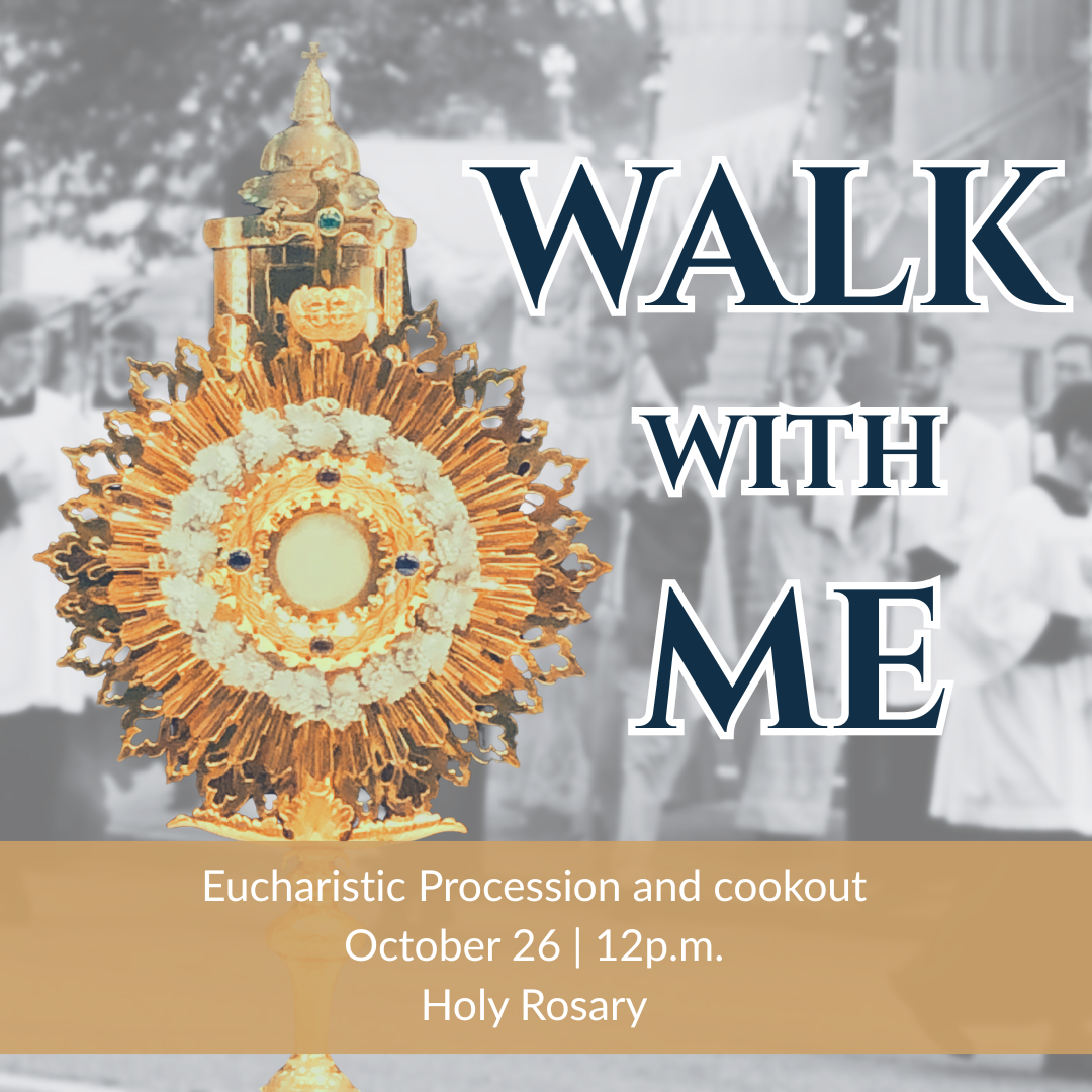 Our Family of Parishes will have a Eucharistic Procession on Sunday, October 26 at Holy Rosary. Please join us in walking with Jesus and stay for a cookout afterwards.